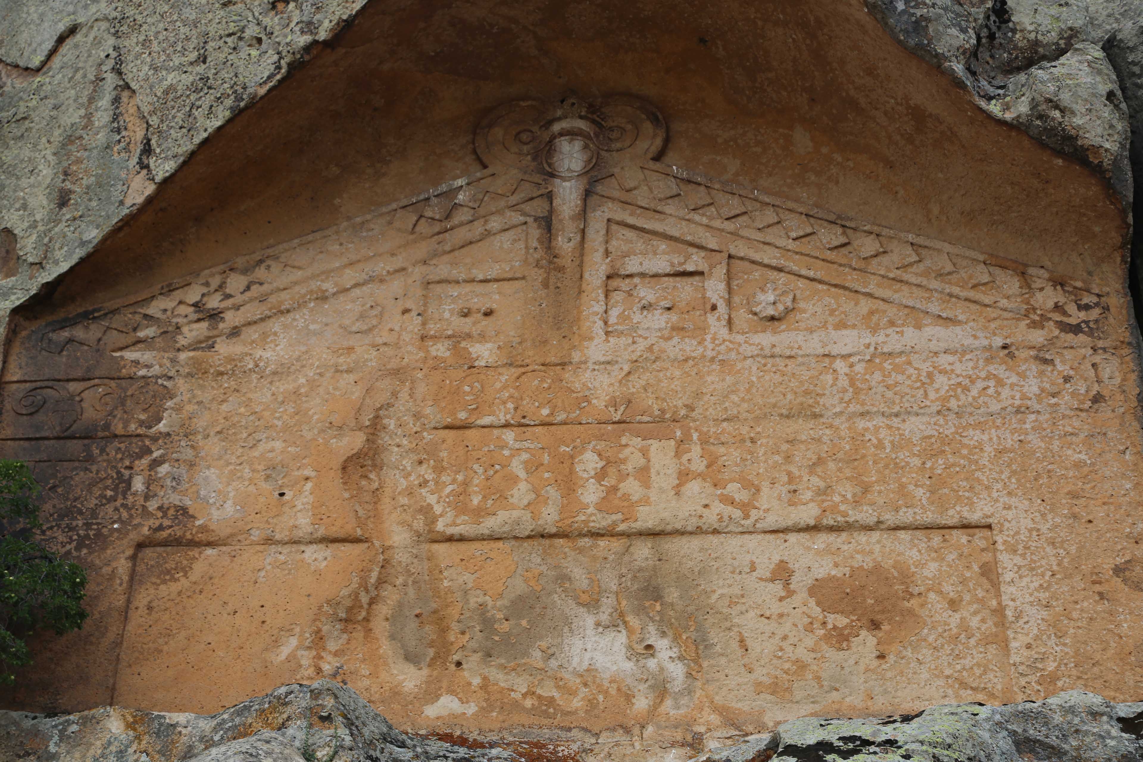 Anıtın cephe duvarı 3.70 m x 4.15 m ölçülerinde dikdörtgendir ve iki çerçeve ile sınırlandırılmıştır. Duvar yüzeyinin ortasında, yanları hafif şişkin dairesel bir alan vardır ve üzerinde küçük bir niş açılmıştır. Çerçeveler, içinde kare panolardan oluşan ve baklava motifi olan bezemelerden oluşur. Üst kısımda kirişin altında kalın friz üzerinde Paleo- Phrygçe yazıt kazınmıştır.