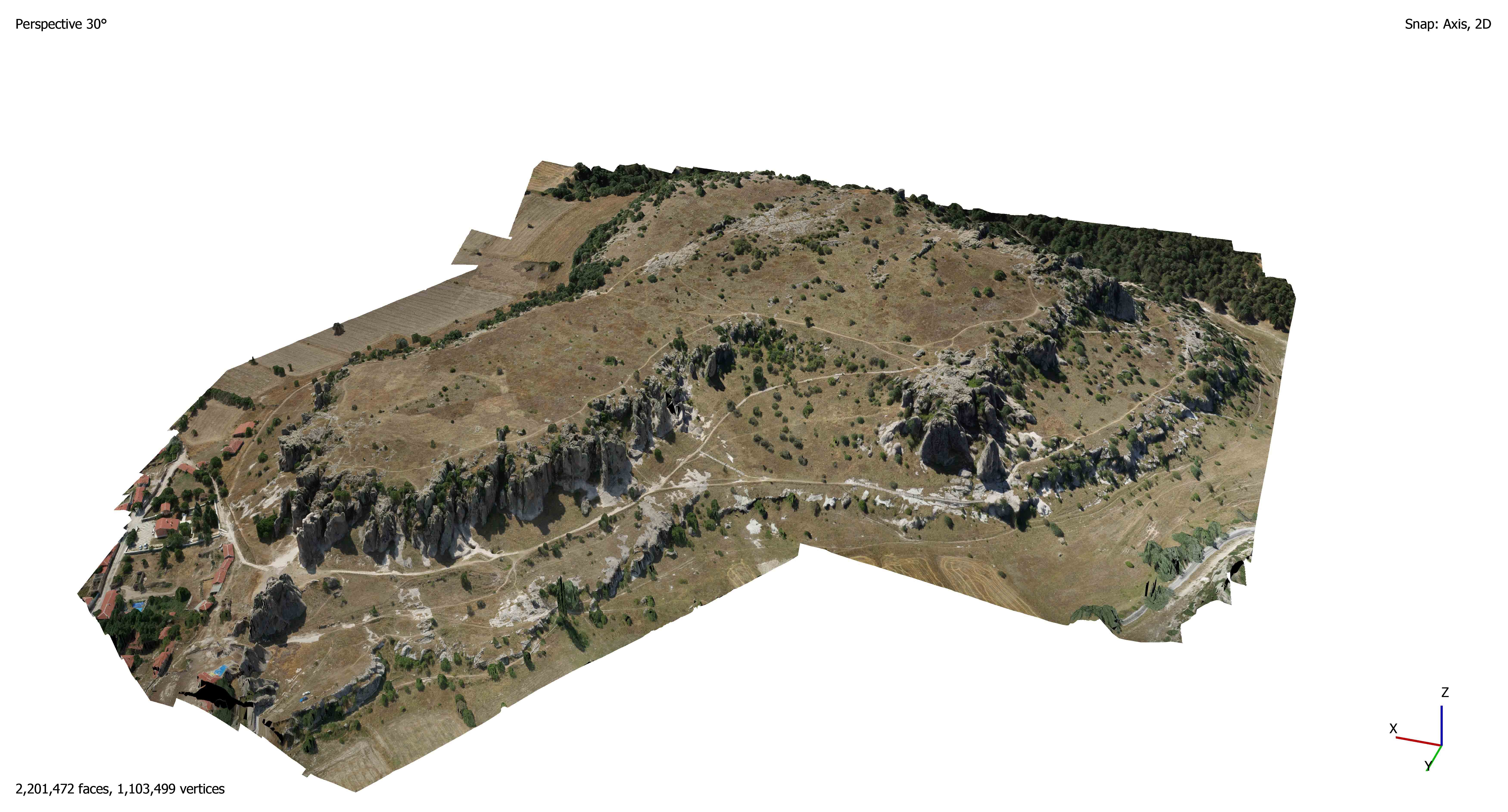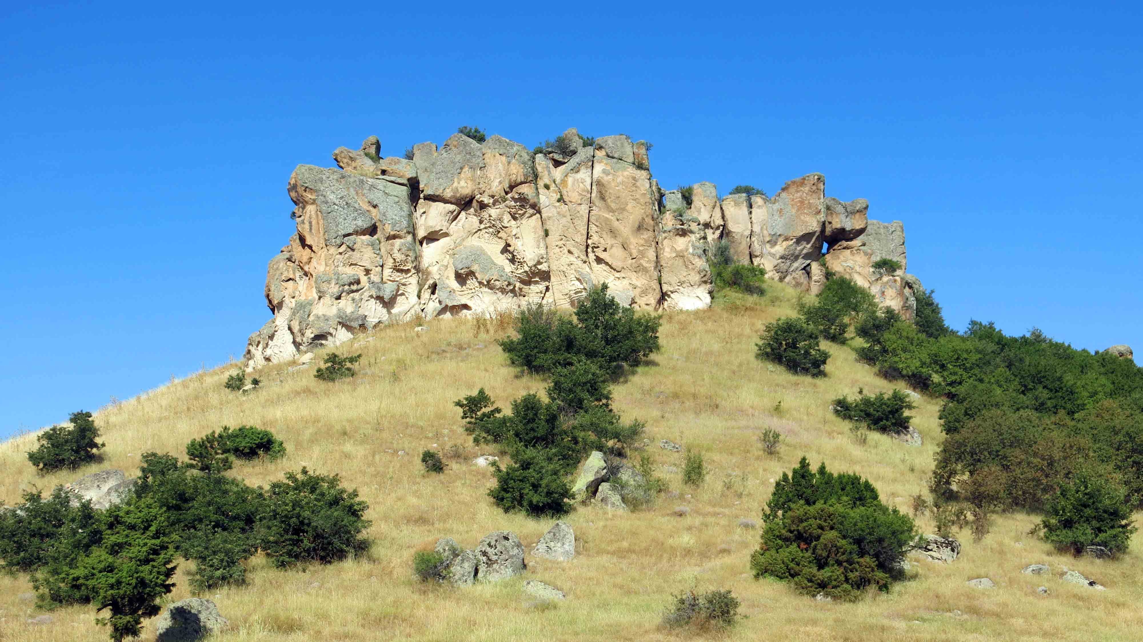 Yerleşimin yayılım alanı içinde platoya çıkan kayaya oyulmuş yollar, plato üzerinde anakaya yontularak yapılmış anıtsal ölçekli kaya sunakları, girişleri platodan başlayan merdivenle inilen tonoz örtülü kaya tüneli, güneybatı yönde alt terasta birbiriyle bağlantılı anıtsal girişli, basamaklı üç kaya sarnıcı en önemli yapıları oluşturmaktadır. Yerleşmeyi çevreleyen tüf kayalarda ise fasad, basamaklı sunak ve nişlerden oluşan çok sayıda kült yapısı ve oda mezar bulunmaktadır.