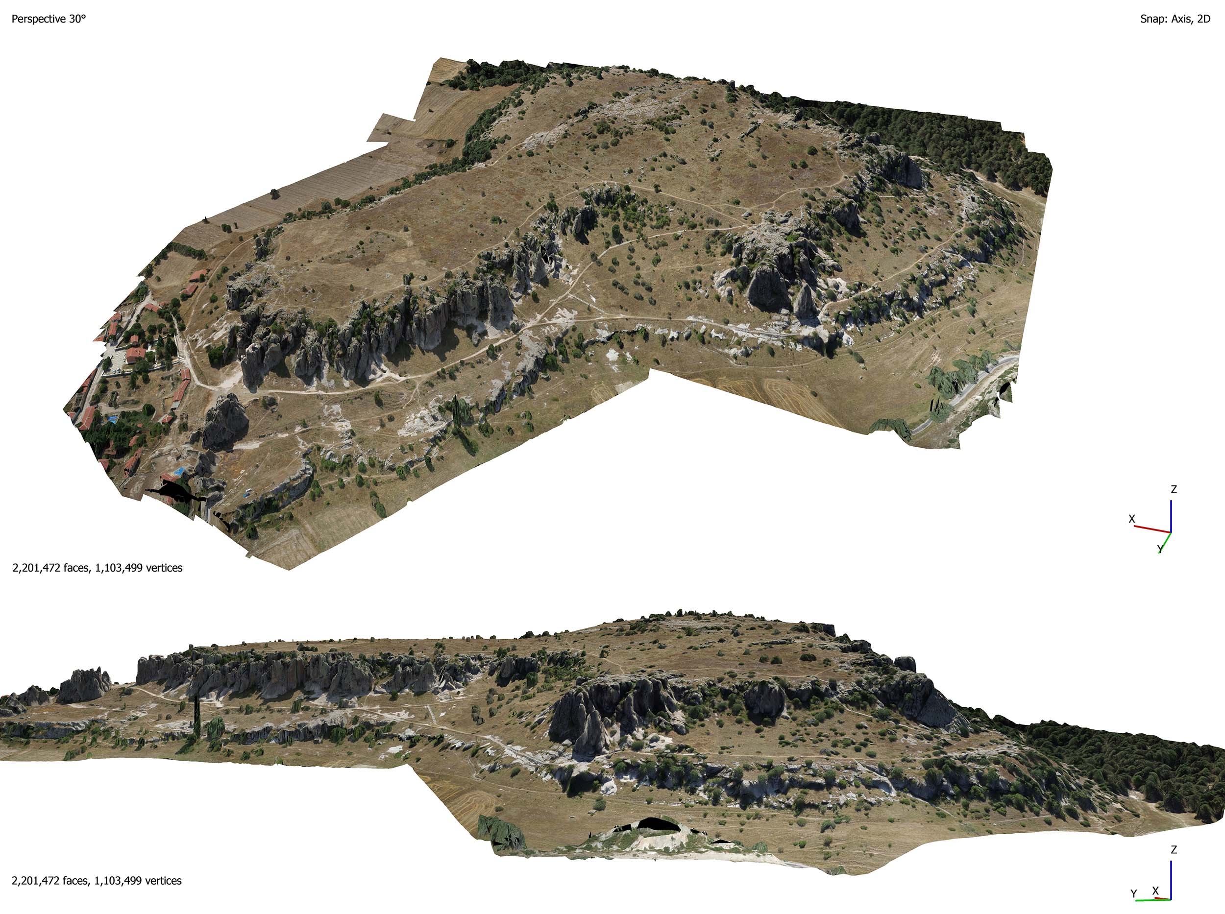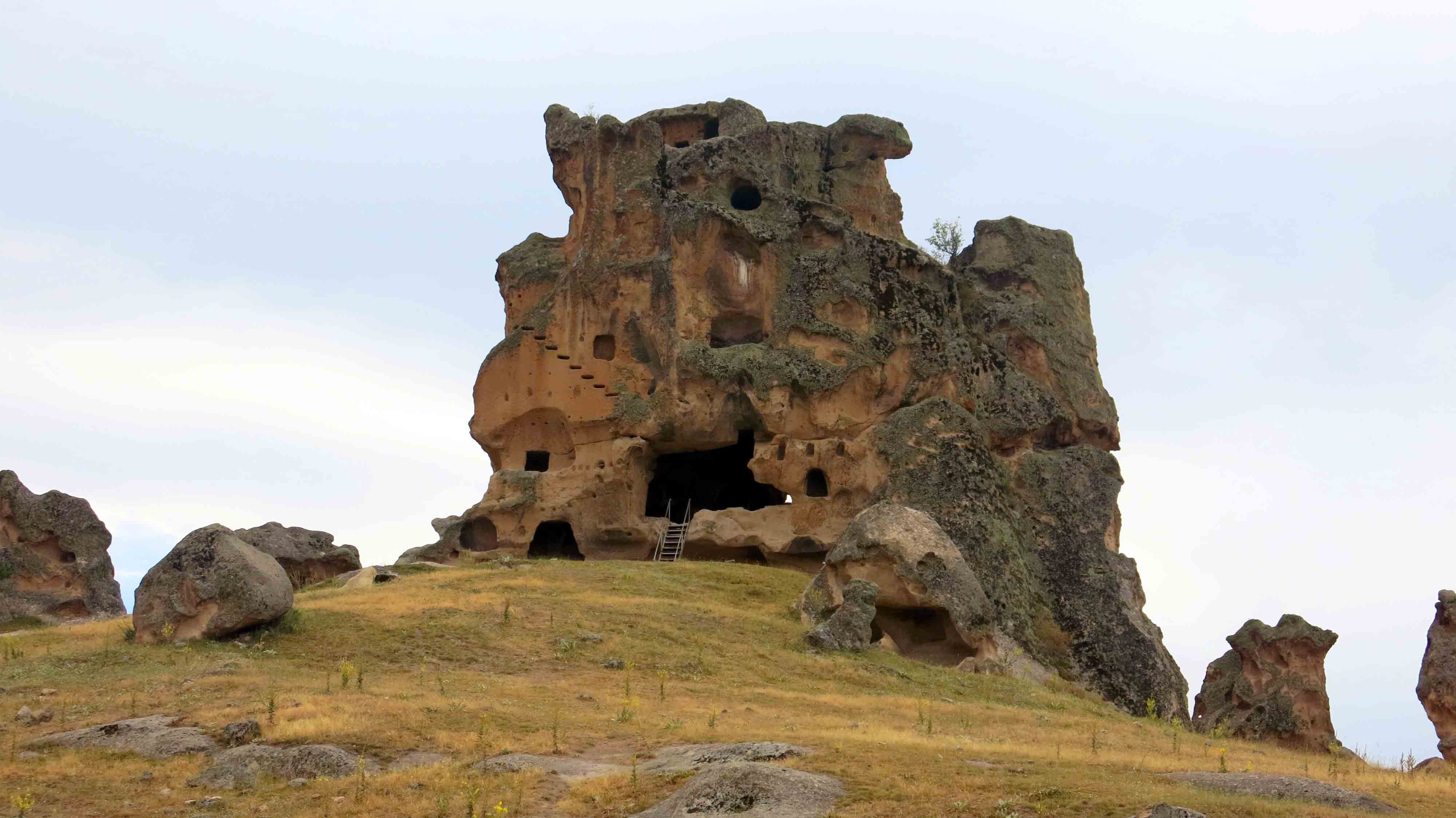 Yerleşimin yayılım alanı içinde platoya çıkan kayaya oyulmuş yollar, plato üzerinde anakaya yontularak yapılmış anıtsal ölçekli kaya sunakları, girişleri platodan başlayan merdivenle inilen tonoz örtülü kaya tüneli, güneybatı yönde alt terasta birbiriyle bağlantılı anıtsal girişli, basamaklı üç kaya sarnıcı en önemli yapıları oluşturmaktadır. Yerleşmeyi çevreleyen tüf kayalarda ise fasad, basamaklı sunak ve nişlerden oluşan çok sayıda kült yapısı ve oda mezar bulunmaktadır.