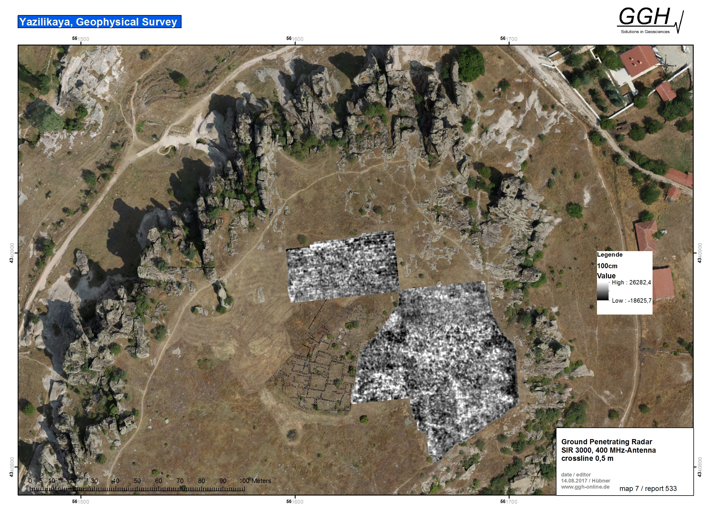 GSSI’a ait SIR 3000 sistemi, 400 Mhz anten ve bir araba kullanılarak yapılmıştır (fig 2).Harita 4 ve 5 te zaman dilimleri sunulmuştur (yüzeyden 20 cm, 60 cm ve 100 cm aşağıda). 400 Mhz anten 10 cm den büyük objeleri algılama kapasitesine sahiptir. Elektromanyetik dalgaların maksimum nüfuz etme (penetrasyon) oranı 1 m civarındadır. Ölçümlerdeki büyük kısıtlamaların sebebi yer altındaki elektrik iletkenliğine bağlı enerji emilimidir. Kireçtaşı ve kil gibi iyi iletken taşlar elektromanyetik dalgaların nüfuz etmesini bir kaç desimetre kısıtlayabilir. Yazılıkaya’da da tüf olan anakaya üzerindeki killi toprak buna benzer bir problem yaratmıştır.